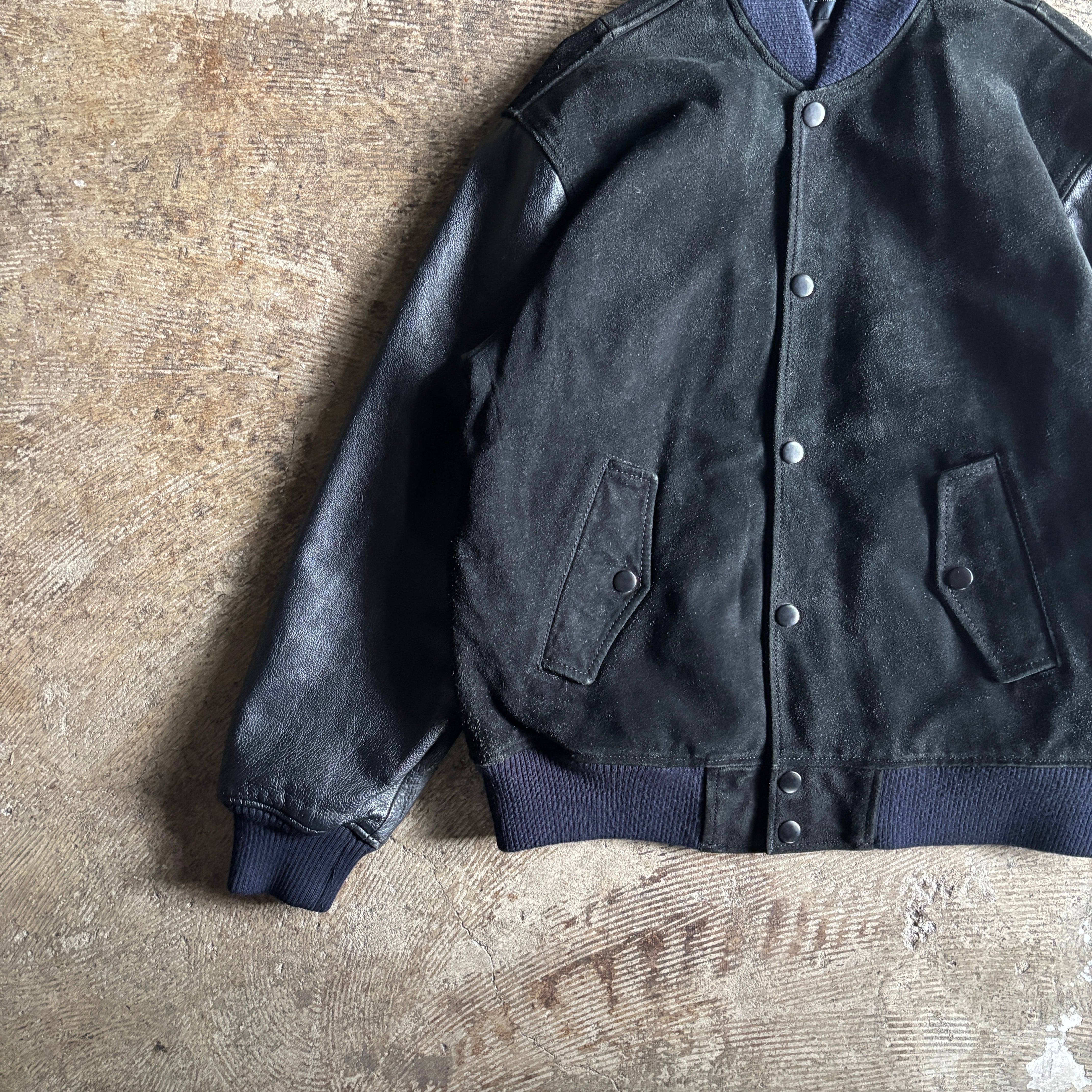 商品説明:90sレザースタジアムジャケット。バックプリントがカッコよく、アメカジやストリートに最適な1着。