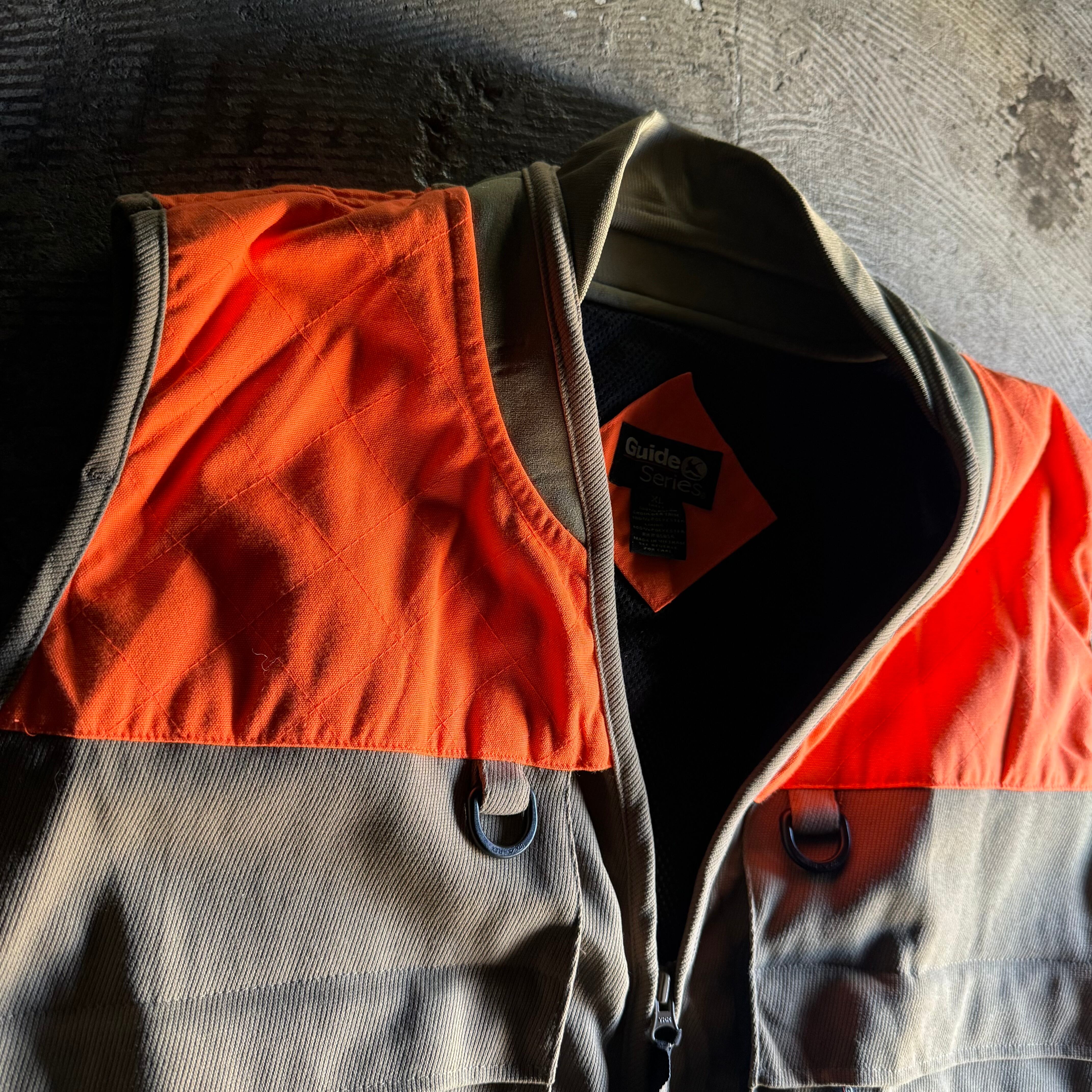 商品説明:GUIDESERIESのギミックベスト。タグはありませんがかなり状態は綺麗です。前面及び背面の背中部分等ととにかく収納箇所が多く、それぞれのポケットも大きめの作りで大抵のものは入ります。サイズもXLと大きめのサイズ感なのでアウターの上から等もレイアードを楽しめるベストです。