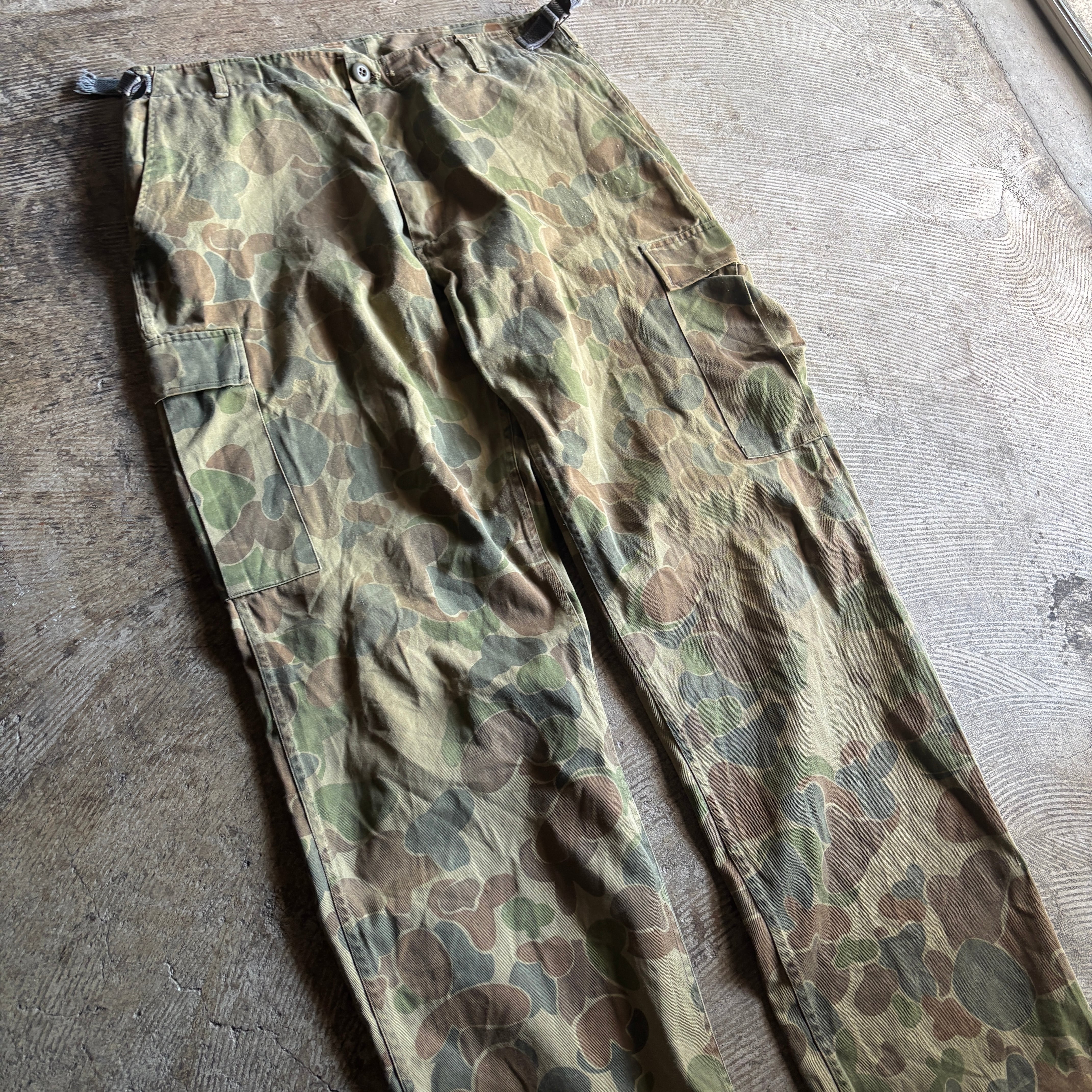 商品説明:ダックハンターカモの迷彩柄パンツ。デザイン製が高く、アメカジに必須なアイテムです。