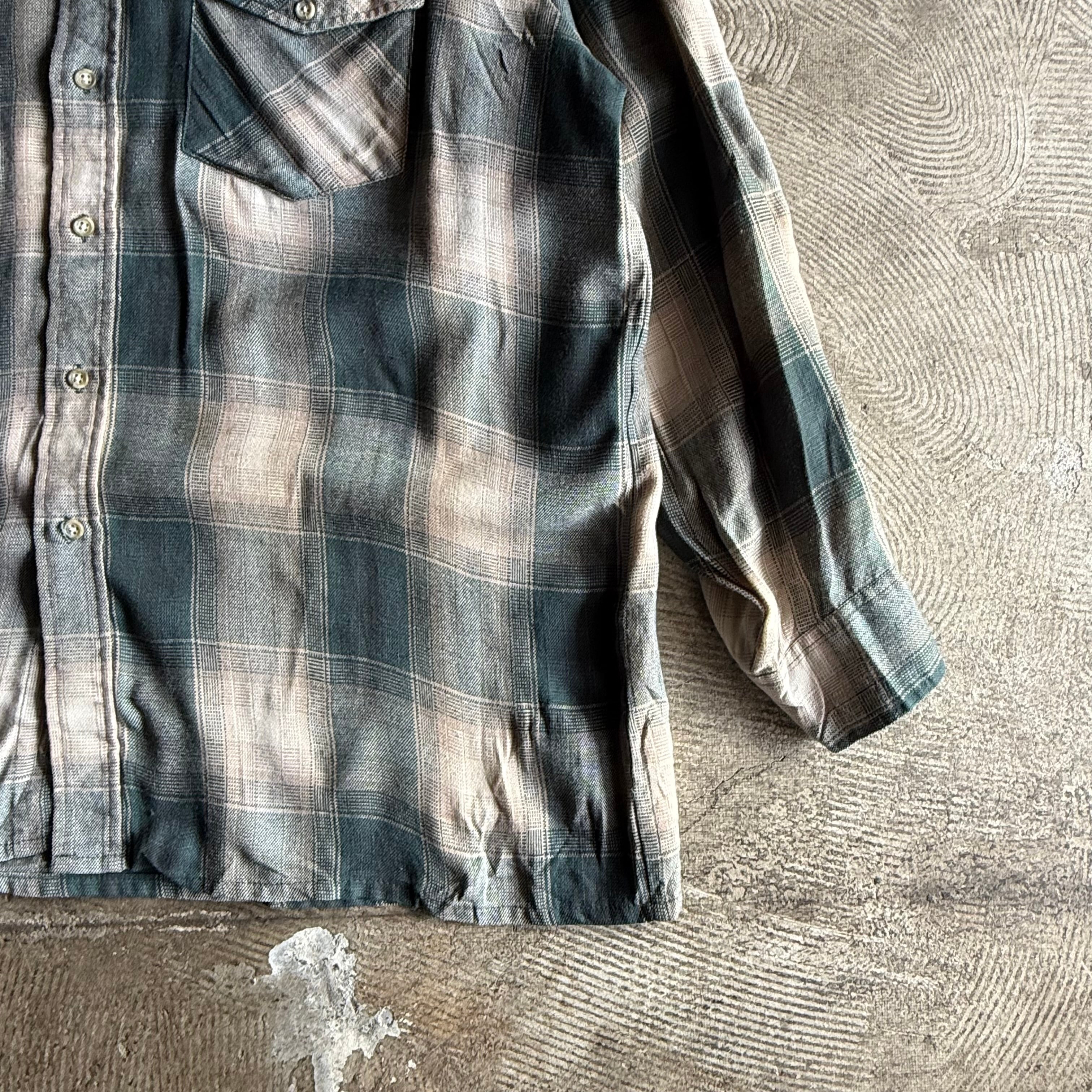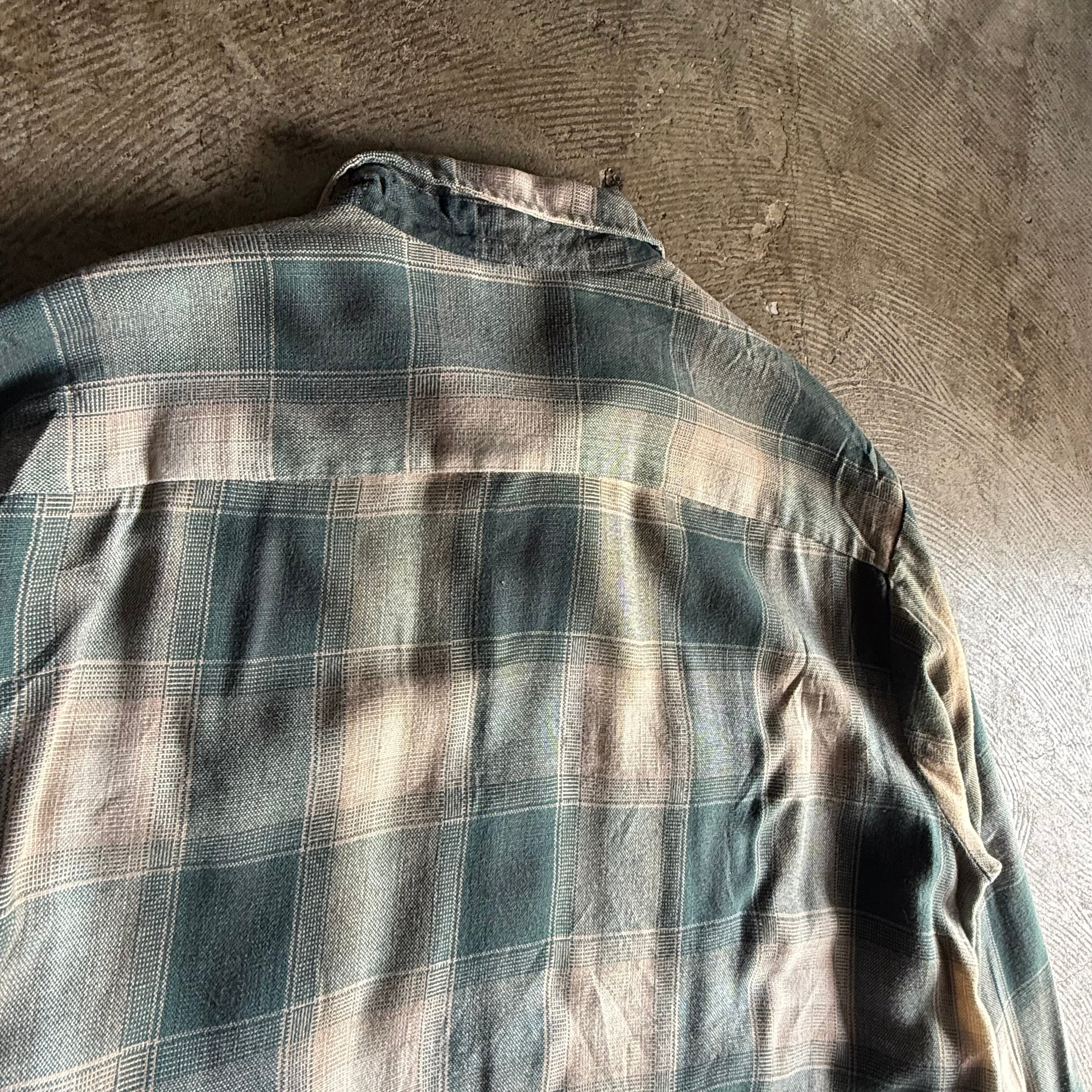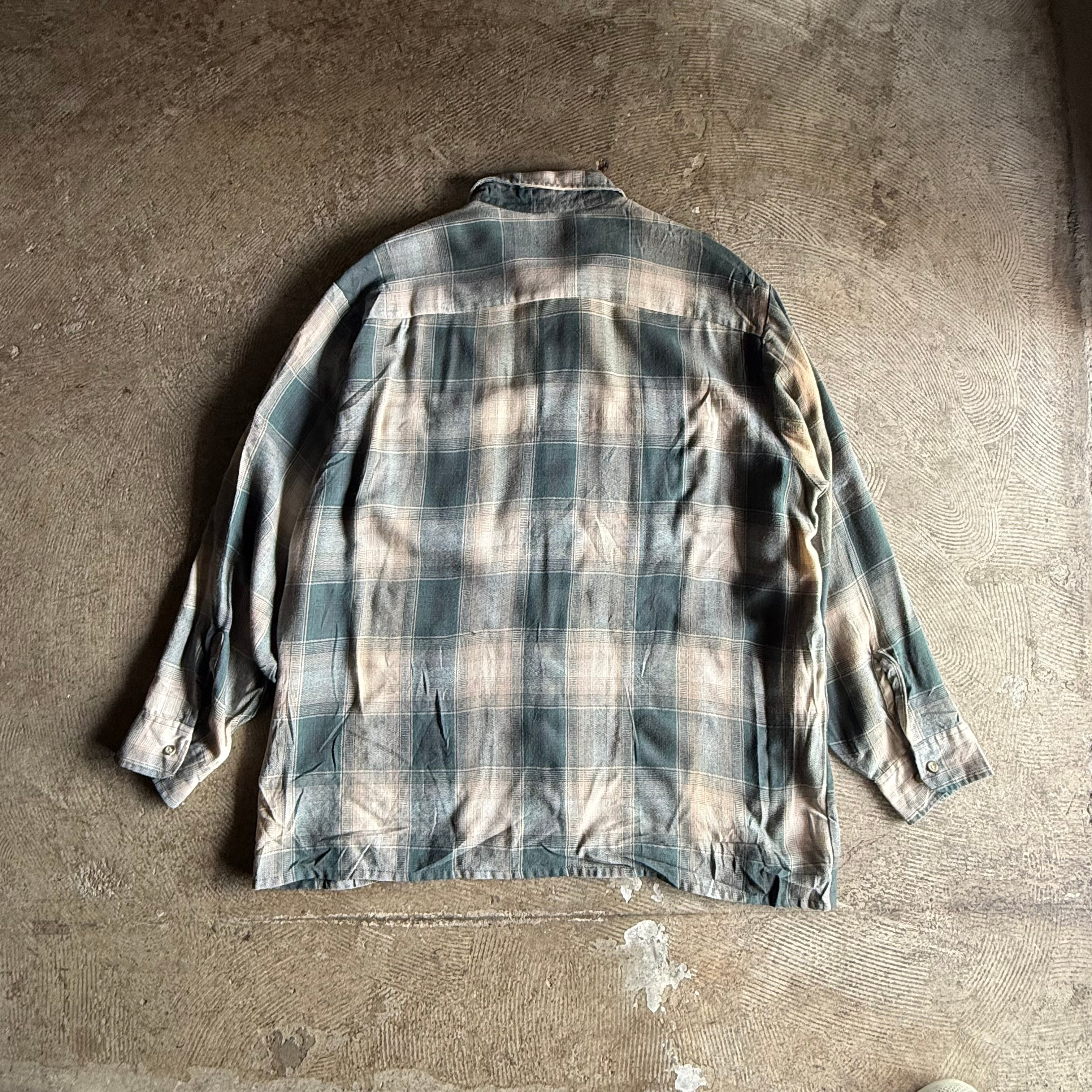 商品説明 80年代頃のVAN HEUSENのシャドーチェックのアクリルシャツ。大き目なチェックとベージュの色味から落ち着いた雰囲気が感じられる一枚。
